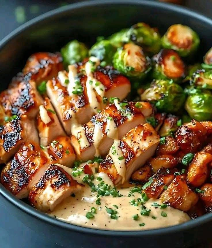 Kurczak w miodzie i czosnku z pieczonymi brukselkami i chrupiącymi ziemniakami